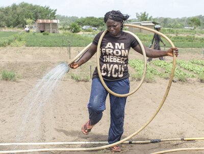 Sylvies Anbaufläche ist ein Viertel Hektar gross. Sie hat «ein wenig von allem»: Kohl, Karotten, Salat. Sylvie schlüpft in die Flipflops und geht zu ihrem Brunnen, wirft den Dieselmotor an, der Grundwasser aus neun Metern Tiefe hochpumpt, und zieht den blassgelben Wasserschlauch hinter sich über den Sandboden. Täglich wässert sie mehrmals, insgesamt bis zu drei Stunden. Die Trockenheit ist ihr grösster Feind.
