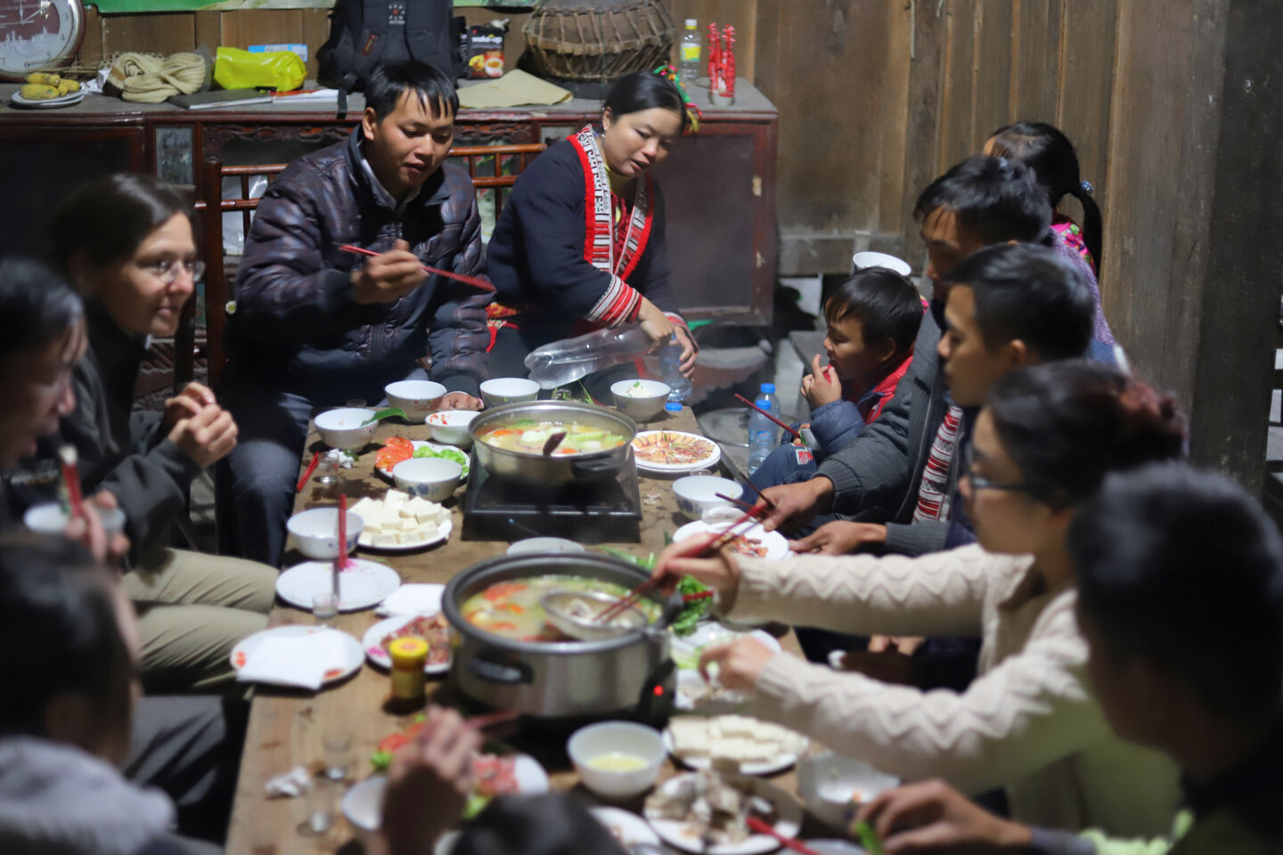 Eifrig suchen Liêu, Quyên und die Tischnachbarn besonders feine Häppchen aus und legen sie in unsere Essschalen. Nach dem Essen wechseln die Gäste die Tische und halten mal hier, mal da ein fröhliches Schwätzchen. Immer wieder kommt jemand an unseren Tisch und versucht, ein paar Worte mit uns zu wechseln. Wie es bei den Roten Dao Tradition ist, stossen wir mit jedem von ihnen mit unserem Reiswein an. «Chúc sức khoẻ» – auf unser aller Gesundheit!