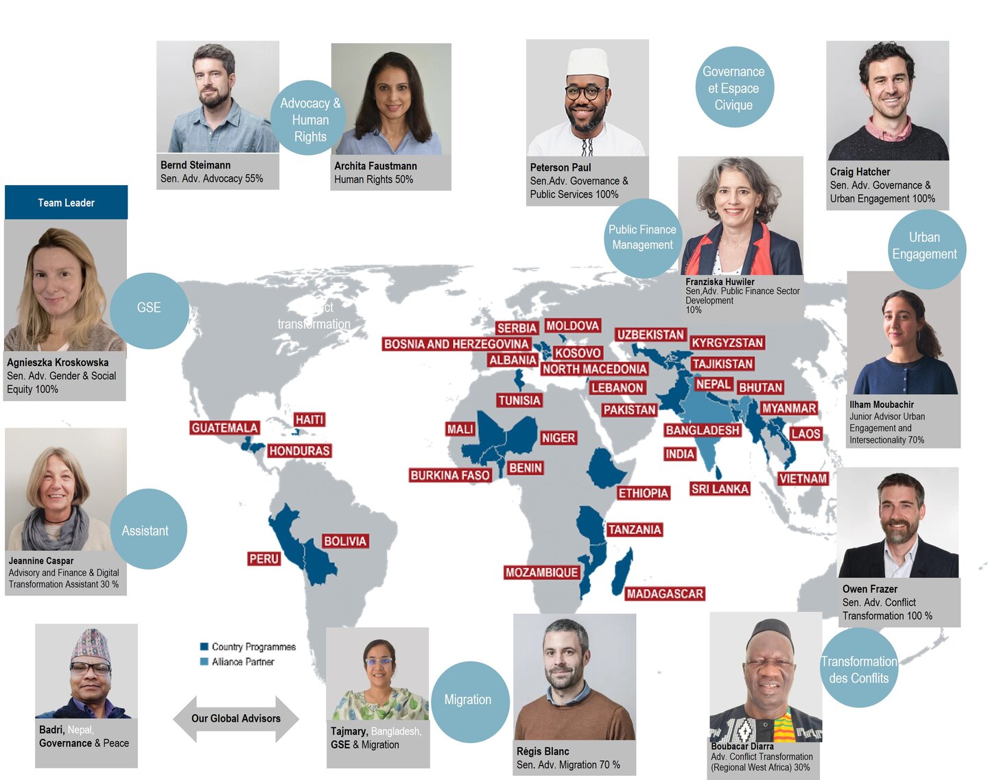The diverse team of senior experts and advisors is always ready to collaborate, support, facilitate, advise, plan, review, strategize, evaluate, train, coach and more, depending on the context and needs. The team works with our project teams and partners, while also carrying out short consultancies and longer backstopping assignments for external clients in Switzerland and abroad.